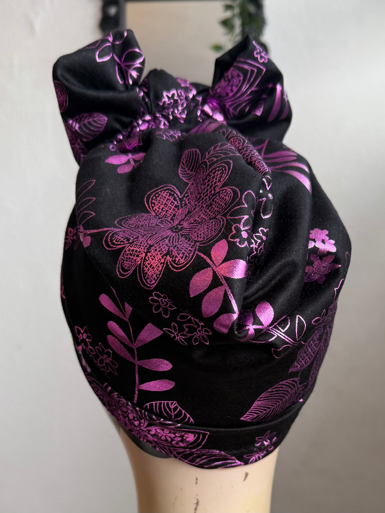 WORKWEAR KNOT Black with Purple/Magenta Foiling (Full Coverage) 1940s Style Pre-tied Turban