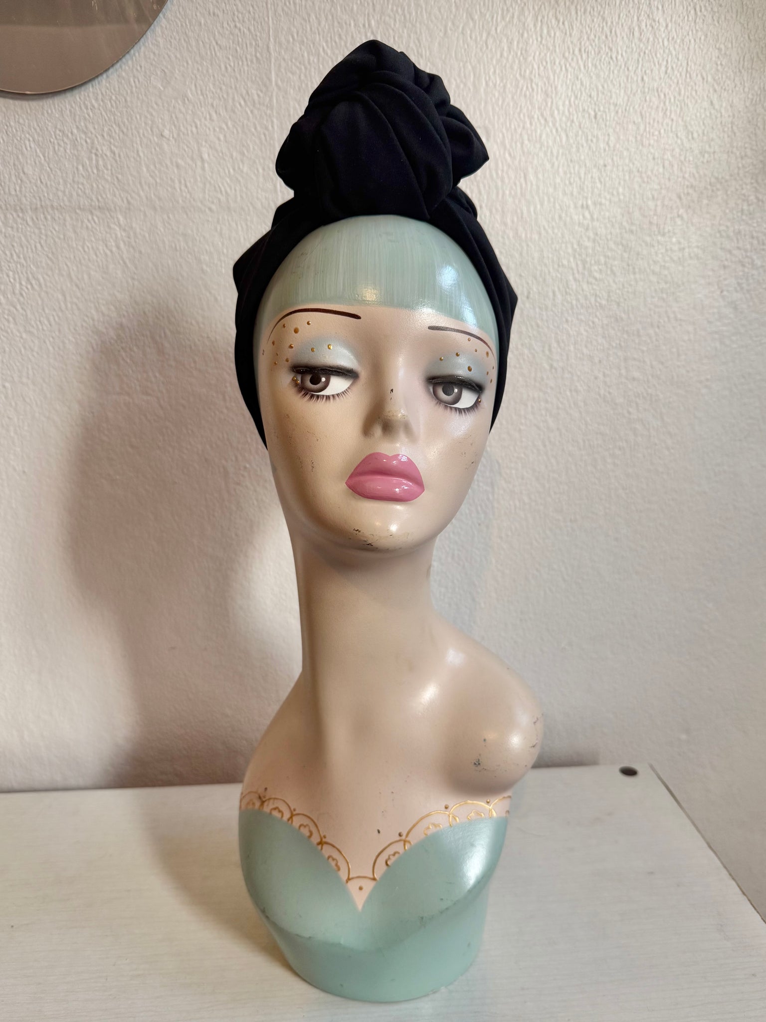 50% OFF SALE ITEM: Black Scuba Style Jersey (Full Coverage) 1940s Style Pre-tied Turban with Small Knot