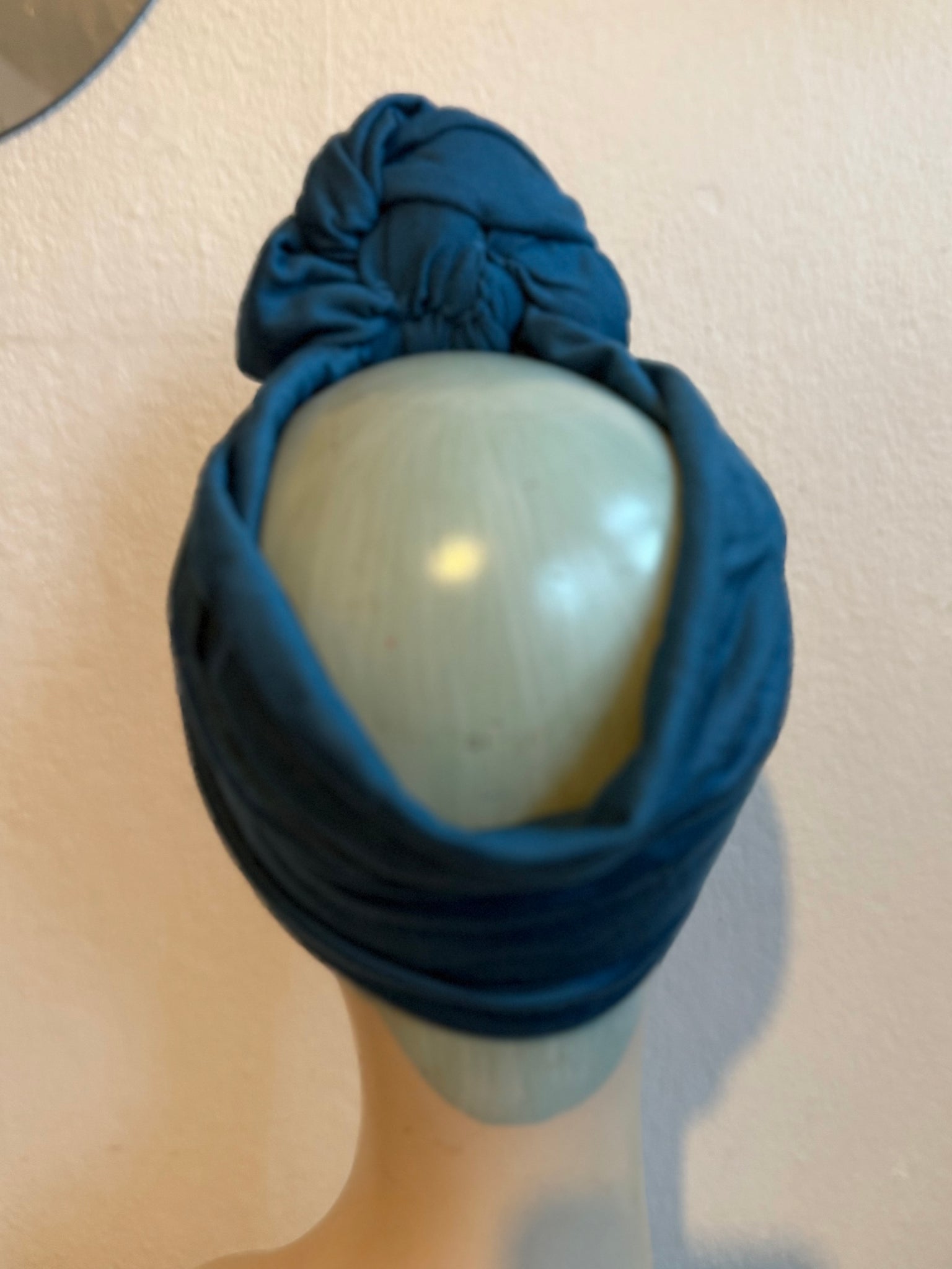 This headband wasinspired by the headscarf/turbans of the 1940s and is pre-tied with the knot sewn in place and made from stretchy fabric so you can wear it straight away. This design has a band that is approx 16cm wide.
