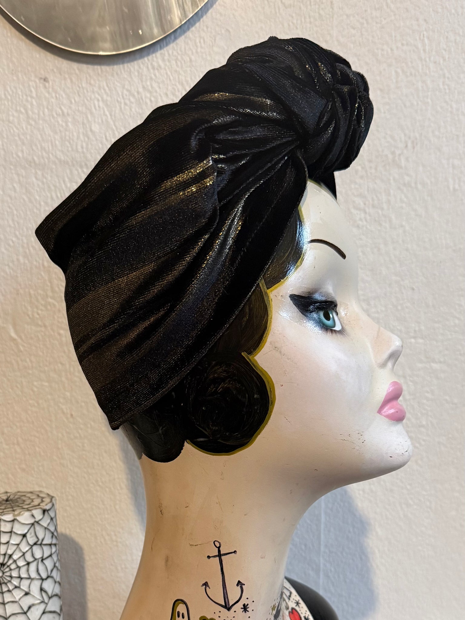 Gold & Black Velvet (Full Coverage) 1940s Style Pre-tied Turban Raised Knot