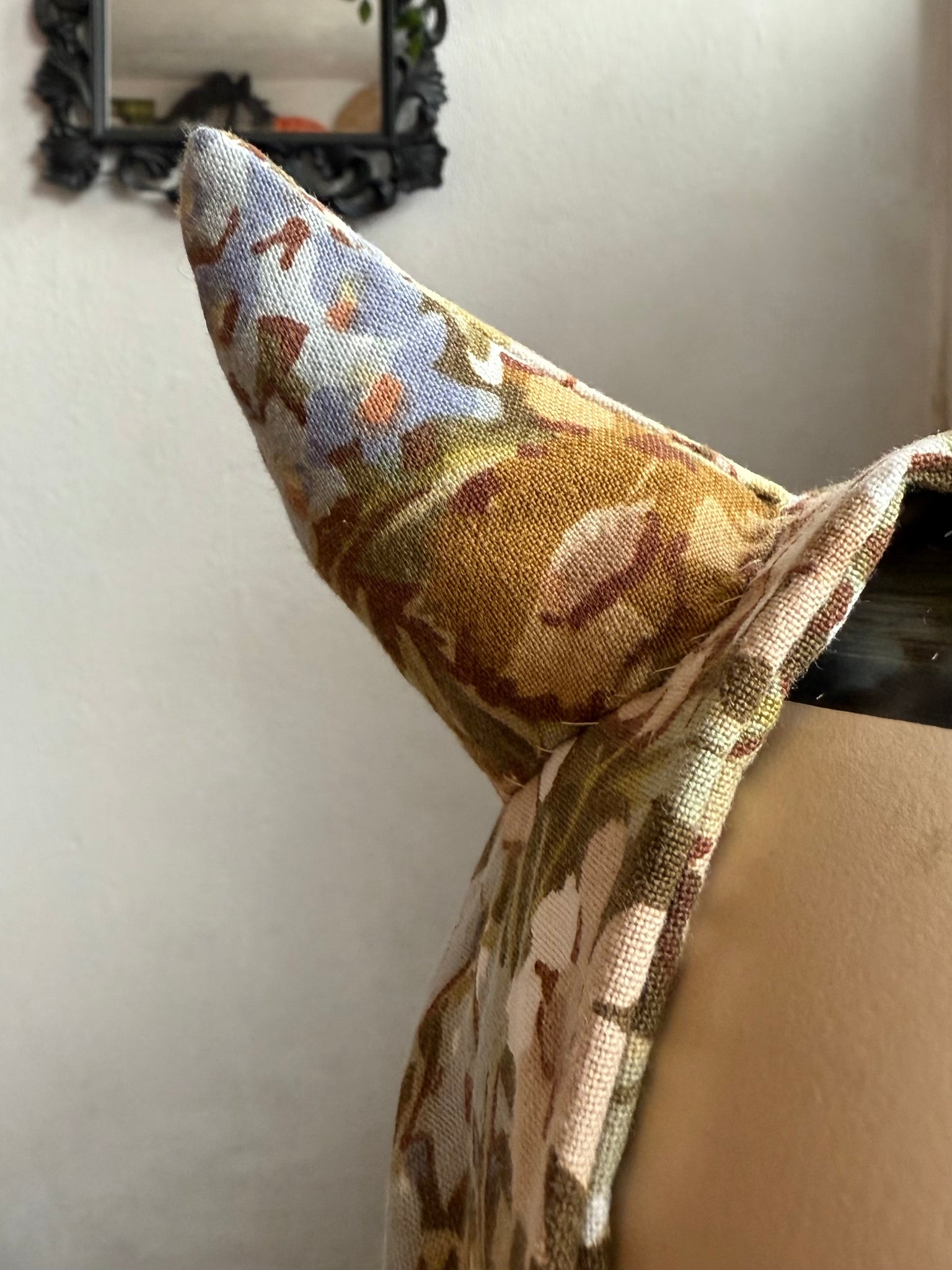 Materials: Outer & lining fabric is upcycled curtain fabric. These fabrics have been washed prior to use in vegan, non-bio, detergent. Horns contain polyester wadding. Metal snap clip with silicone grip. Material details are based on the best available information and may vary.